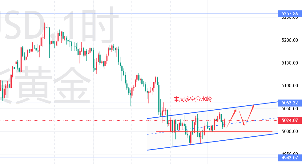 从小级别盘面(小时线)来看,本周已经走过的行情态势呈现出明显的规律:低点逐步抬升,高点在创下短期新高后随即回落 ,目前已经初步形成一个平行上行的通道雏形。对于这种明确的形态,我们无需过度纠结方向,按照通道形态顺势操作即可。当前金价处于5000美元关口之上 ,欧美盘时段需重点关注此位置的支撑有效性——若能守住5000关口,金价有望继续向上方阻力发起冲击;若跌破此关口,则可能再次回归震荡下行 。上方阻力方面 ,重点关注5050美元和5062美元两个关键位置,其中5062美元作为多空分水岭,一旦有效突破 ,或将打破当前震荡格局 ,开启新一轮上行走势。